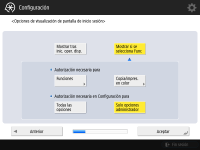 Inicie la sesión con autenticación para configurar las opciones que requieren privilegios de Administrador. ![]() ![]() Pulse <Iniciar sesión> y vuelva a introducir el nombre de usuario y la contraseña de un usuario con privilegios de administrador. El nombre de usuario predeterminado del administrador es "Administrador", y la contraseña predeterminada es "7654321". Vuelva a pulsar <Iniciar sesión> y luego pulse <Aceptar>. Si introduce la contraseña predeterminada de fábrica, aparecerá la pantalla pidiéndole que cambie la contraseña. También puede cambiarla más tarde. Iniciar una sesión como Administrador Puede omitir las opciones que requieren privilegios de Administrador y proceder al paso siguiente pulsando <Omitir>. En este caso, proceda al Paso 11. | |
