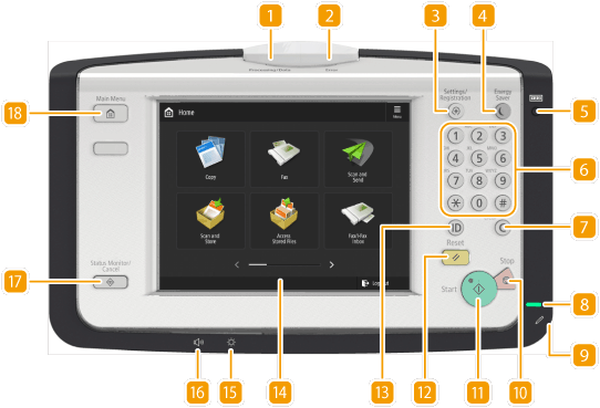 : | Indicador Processing/Data Pisca enquanto operações como enviar ou imprimir estão sendo realizadas. Acende uma luz verde quando há documentos esperando para serem processados. |
