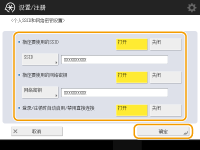 要使用个人设置,需要通过个人认证管理登录。 管理用户可用设置可以对下列设置进行配置。 触摸面板显示屏幕上使用的语言 针对有视力障碍和肢体活动障碍、难以在触摸面板显示屏幕上查看或执行输入操作的用户的可用性功能 个人访问点(个人SSID/网络密钥) 登录后自动打印作业 |