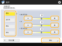 调整完成之后可以注册最多四个设置。色彩调整之后,按<恢复/注册> ,从<C1> 到 <C4>中选择一个按钮 按<注册> <是> <确定>。![]() 要调用已注册的设置,请按<恢复/注册>,选择一个按钮,然后按<确定>。 可以更改 <C1> 到 <C4>的按钮名称。选择要更改名称的按钮,按<重新命名>,然后输入新的名称。 要删除已注册的设置,选择按钮 ,然后按<删除> <是>。 |