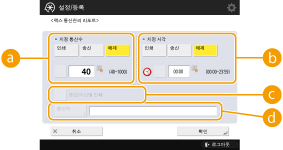 <관리설정>의 <작업이력 표시>를 <해제>로 설정한 동안에는 팩스 활동 리포트에 대한 설정을 구성할 수 없습니다. 또한 <관리설정>의 <작업이력 표시>를 <해제>에서 <설정>으로 변경하면 팩스 활동 리포트의 <지정 통신수> 및 <지정 시각>이 자동으로 <해제>로 변경됩니다.<작업이력 표시> |
