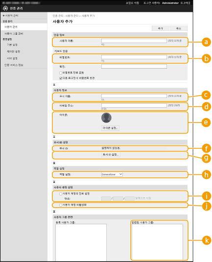 uid | 예 | 1~32자 | 제어 문자, 1바이트 공백, 다음 문자: \ / : * ? | < > [ ] ; , = + @ " | ![]() | 가져올 때 반드시 입력해야 합니다. 설정에 따라 "@"를 사용할 수 있습니다. <사용자명에 @ 의 사용을 허가> |