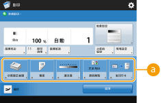 可將基本功能畫面顯示的設定按鈕(影印、傳真和掃描)變更為 <選項> 中的其他設定按鈕。在基本功能畫面放置常用設定按鈕,就能夠更有效地使用功能。此外,透過個人認證管理登入後,您可顯示針對每個使用者所自訂的不同基本功能畫面。