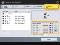 Quando si preme  (Monitoraggio stato/Annulla), viene visualizzata la schermata Monitoraggio stato, che consente di verificare il livello del toner o altre indicazioni di stato.