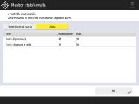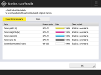 Premere  (Monitoraggio stato/Annulla)  <Consumab./Altro>  <Controllo consumabili>.