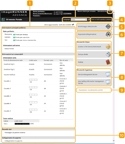 Quando si effettua l'accesso alla IU remota, viene visualizzata la pagina del portale riportata qui di seguito. Questa sezione descrive le voci visualizzate sulla pagina del portale e le operazioni di base.