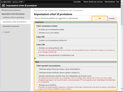 Le impostazioni della macchina relative alla sicurezza delle informazioni possono essere applicate e gestite in batch. Si consiglia all'amministratore della sicurezza delle informazioni incaricato della gestione del criterio di sicurezza di applicare il criterio di sicurezza alla macchina conformemente al criterio della propria organizzazione. Per configurare il criterio di sicurezza, accedere alla IU remota con i privilegi di Amministratore.