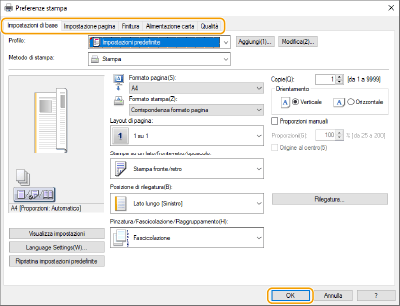 Passare tra le schede come opportuno per specificare le impostazioni di stampa desiderate.