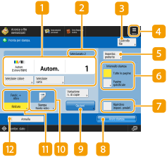 Visualizza lo stato delle impostazioni quali dimensioni della carta da stampare e numero di stampe. Verificare le impostazioni per eseguire una stampa corretta. Per modificare le impostazioni, premere il pulsante sotto la sezione di visualizzazione. Per modificare il numero di stampe, inserire il numero usando la tastiera numerica.