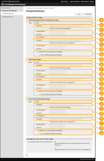 Die Einstellung zur Anzeige des Inhalts nach Abmeldung wird aktiviert, wenn <Einstellungen Anzeige Login-Anzeige> auf <Anzeige, wenn Gerätevorgang startet> gesetzt ist. Um den Inhalt nach Aktivierung des automatischen Rückstellungsmodus anzuzeigen, setzen Sie <Zeit bis zur automatischen Rückstellung> auf mindestens 1 Minute.