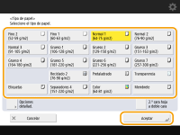 <Aceptar>. Registrar el tamaño y el tipo de papel de uso frecuente para la bandeja multiuso