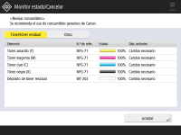 (Monitor estado/Cancelar), se muestra la pantalla Monitor estado, donde se pueden revisar el nivel de tóner u otras indicaciones de estado.