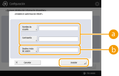 <Nombre de usuario>/<Contraseña>Introduzca el nombre de usuario y la contraseña de un administrador con privilegios de Administrador. Compruebe que este administrador está registrado como usuario en el equipo cliente y en el servidor de autenticación utilizado por el equipo cliente.