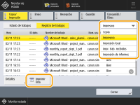 Si  (Configuración)  <Opciones de gestión> <Gestión del dispositivo> <Restringir el acceso a trabajos de otros usuarios> está configurado en <Sí>, los trabajos que no pertenezcan al usuario que ha iniciado sesión se muestran como "***" y no pueden utilizarse. Si inicia una sesión con privilegios de administrador, aparecen los trabajos de todos los usuarios.