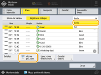 Al pulsar  (Monitor estado/Cancelar) aparece la pantalla Monitor de estado, que le permite consultar el historial de uso de cada función, tales como copia, impresión, envío por correo electrónico, envío/recepción de faxes/I-faxes, guardar archivos en "Espacio avanzado", etc. Desde esta pantalla, también puede imprimir el historial de uso para cada función.