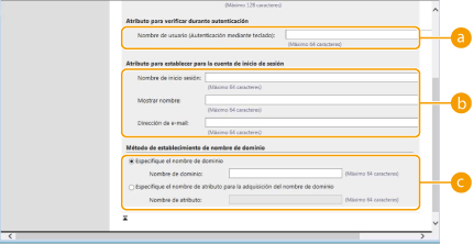 4 | Especifique cómo configurar los nombres de atributos y el nombre de dominio. ![]() [Nombre de usuario (Autenticación mediante teclado):]Especifique el campo de datos LDAP (nombre de atributo) del nombre de usuario en el servidor LDAP (Ejemplo: uid). [Nombre de inicio sesión:] / [Mostrar nombre] / [Dirección de e-mail]Especifique los campos de datos (nombres de atributo) del nombre de inicio de sesión, el nombre visualizado y la dirección de correo electrónico de cada cuenta de usuario en el servidor LDAP (Ejemplo: uid, cn, mail). [Especifique el nombre de dominio] / [Especifique el nombre de atributo para la adquisición del nombre de dominio]Seleccione cómo configurar el nombre de dominio del destino de inicio de sesión. Para especificar el nombre de dominio directamente, seleccione [Especifique el nombre de dominio] e introduzca el nombre de dominio. Para especificar un campo de datos LDAP (nombre de atributos) desde el que adquirir el nombre de dominio en el servidor LDAP, seleccione [Especifique el nombre de atributo para la adquisición del nombre de dominio] e introduzca el nombre de atributo (Ejemplo: dc). |