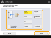 2 | Seleccione el tamaño de papel. ![]() ![]() Para obtener información sobre los tamaños de papel mostrados cuando se pulsa <Otro tamaño>, consulte Papel disponible. |