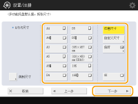 1 | 按<自定义尺寸>。 ![]() 您可以将纸张尺寸指定为 <任意尺寸>,这样就不必再输入纸张尺寸设置。在添加未知尺寸的纸张用于复印时或纸张尺寸已经在打印机驱动程序中注册时指定 <任意尺寸>。 |