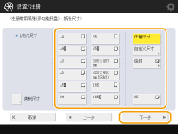 1 | 按<自定义尺寸>。 ![]() 您可以将纸张尺寸指定为 <任意尺寸>,这样就不必再输入纸张尺寸设置。在添加未知尺寸的纸张用于复印时或纸张尺寸已经在打印机驱动程序中注册时指定 <任意尺寸>。 |