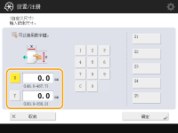 按<X>或<Y>,使用数字键输入各边的长度。 ![]() 如果将常用纸张尺寸注册到按钮<S1>到<S5>,只需简单一按即可进行调用。 注册任意尺寸纸张(自定义尺寸纸张) | |