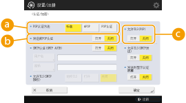 2 | 指定各个项目。 ![]() <POP认证方法>设置POP3服务器的认证方法。要对认证期间的密码进行编码,请选择<APOP>。要在接收邮件(POP)时认证用户,请选择<POP认证>。 <发送前POP认证>要使用POP3服务器执行认证,请按<打开>。 <允许TLS(POP)>要使用TLS对通过POP3服务器的通信进行编码,请按<打开>。设置<打开>时,可以在与服务器通信期间确认TLS服务器证书,然后将CN添加到验证项目。<确认POP接收的TLS证书> |