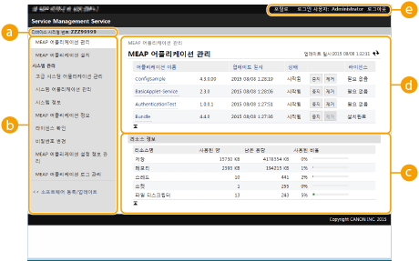 상세정보를 확인하고 설정을 변경하는 것 외에도 리모트 UI의 SMS를 사용하여 MEAP 응용 프로그램을 업그레이드하거나 응용 프로그램을 제거할 수도 있습니다.