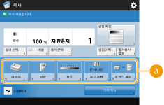 기본 특징 화면에 있는 설정 항목의 수와 표시될 위치는 기능에 따라 달라집니다. <할당없음>을 단축키로 설정하면 단축키 버튼이 표시되지 않습니다. 등록할 수 있는 <기타 기능>에 대한 단축키의 수는 다음과 같이 제한됩니다. 복사(기본): 5 복사(고속): 6 팩스: 4 스캔 및 전송: 2 복사 기본 특징 화면을 고속 복사 화면(설정을 빠르게 변경(고속 복사 화면))으로 변경했으면 3단계의 버튼을 선택하고 <등록>를 누릅니다. |