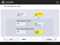 설정 가이드를 사용하지 않는 경우, 1단계에서 <설정 가이드 종료>를 누릅니다. (설정/등록)을 눌러 설정 가이드 중에 구성한 설정을 나중에 개별적으로 지정할 수 있습니다. |
