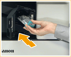 스테이플 카트리지의 녹색 손잡이를 잡고 끝까지 밉니다.
