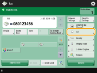 To check the total number of specified destinationsThe total number of specified destinations is displayed on the top right of the screen. This enables you to confirm that the number of destinations is correct before sending. ![]() To send with the sender informationYou can send with the sender's name and fax number. <TX Terminal ID> To check the statuses for sent documentsOn the <Status Monitor> screen, you can check the statuses for sent documents. This screen enables you to send faxes again or cancel sending after checking the statuses. Checking Status and Log for Sent and Received Documents When <Display Notification When Job Is Accepted> is set to <On>, the <Status Monitor> screen can be displayed from the following screen that is shown after a send job is received. <Display Notification When Job Is Accepted> ![]() When a transmission error occurs because the recipient's line is busyThe machine automatically redials after a certain period of time. You can change the settings such as how many times the machine redials and the interval between redials. <Auto Redial> To print the report for the results of sendingOn the Fax Basic Features screen, pressing <Options> <TX Report> enables you to set to automatically print the report listing the results of sending.To set this for each job from <Options>, it is necessary to select <For Error Only> or <Off> in <TX Report>, and then set <Allow Printing from Options> to <On>. When multiple sheets are fedScanning is stopped and the message is displayed on the screen. Follow the instructions to clear the jam. When you have cleared the jam, the resume job screen is displayed. If the machine mistakenly detects multiple sheet feeding, press <Do Not Detect Multi. Sheet Feed> to resume scanning. To set the machine in advance to not notify you of multiple sheet feeding, perform one of the following operations. Each time you send, press <Options> on the Fax Basic Features screen select <Detect Feeder Multi Sheet Fd.> to disable the setting. Set <Set Detection of Feeder Multi. Sheet Feed as Default> to <Off> (<Set Detection of Feeder Multi. Sheet Feed as Default>). When photos in the sent image are too dark or light colors in the background of color originals cannot be removedThe quality of the sent image may be able to be improved if the following conditions/settings are met. Job type: Fax (Memory Sending) or Scan and Send (Fax/I-fax) <Select Color>: <Black & White> (Scan and Send) <Original Type>: <Text> <Density> <Background Density>: <Auto><Resolution>: 200 dpi x 400 dpi, 300 dpi x 300 dpi*, 400 dpi x 400 dpi, or 600 dpi x 600 dpi* *Can be set for Scan and Send <Speed/Image Quality Priority for B&W Scan> Fax/I-Fax Send Jobs: <Quality Priority> (<Speed/Image Quality Priority for B&W Scan>)When multiple telephone lines are setYou can select the telephone line to use for sending faxes by pressing <Options> <Select Line>. For instructions on specifying fax line settings, see Fax Line Settings. |