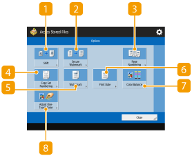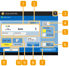 When you press <Access Stored Files> on the <Home> screen, and then press <Mail Box>, <Advanced Space>, <Network>, or <Memory Media> to print files, the following setting screen is displayed.