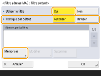 Réglez <Utiliser le filtre> sur <Oui>, sélectionnez <Politique par défaut>, puis appuyez sur <Mémoriser>.