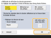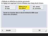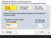 <OK>. Chaque utilisateur peut spécifier l'emplacement de son dossier personnel.1 | Appuyez sur <Dossier de base> <Régler>.![]() |