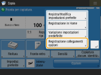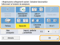 Il numero delle voci di impostazione nella schermata Funzioni di base e la posizione di visualizzazione variano in base alle funzioni. Non viene visualizzato alcun pulsante di scelta rapida se <Non assegnato> è impostato come scelta rapida. Il limite per il numero di scelte rapide per <Opzioni> registrabili è il seguente. Copia: 5 Fax: 4 Scansione e invio: 2 |