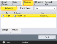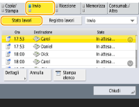 Premendo <Dettagli> <Ritrasmissione> è possibile reinviare i documenti non inviati correttamente. Per specificare un'altra destinazione, premere <Variazione destinazione>. Per i documenti con più destinazioni specificate usando lo stesso metodo di invio, premere <Elenco trasmis. seq.>, selezionare una destinazione, quindi premere <Ritrasmissione> o <Variazione destinazione>.È possibile reinviare i documenti quando <Eliminazione lavori TX non riusciti> è impostato su <Off> (<Eliminazione lavori TX non riusciti>). Non dimenticare che non è possibile reinviare i documenti inviati con invio diretto/invio manuale/PC fax. È possibile cambiare le destinazioni dei documenti impostati per l'invio ad una determinata ora, nonché dei documenti che non sono stati inviati correttamente. Non dimenticare che non è possibile cambiare le destinazioni per i documenti con più destinazioni specificate in fase di invio oppure quando l'inserimento di una nuova destinazione è limitato (Limitazione delle destinazioni disponibili). È possibile modificare la destinazione per un lavoro annullato a causa di errori di trasmissione, oppure per un lavoro in attesa di invio nella modalità di invio ritardato. Non è possibile selezionare più destinazioni insieme. Inoltre, non è possibile modificare le destinazioni in un gruppo contemporaneamente. |