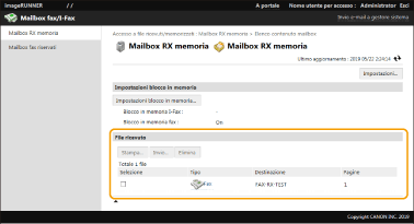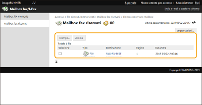 ![]() | È possibile utilizzare la IU remota per stampare, inviare o eliminare i fax e I-fax che sono momentaneamente memorizzati nella mailbox Fax/I-Fax. |