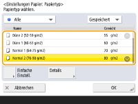 Wenn der eingelegte Papiertyp nicht angezeigt wird, drücken Sie <Detail. Einstell.>, um den Papiertyp aus einer Liste zu wählen.