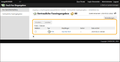 ![]() | Sie können Remote UI verwenden, um die vorübergehend in der Fax/I-Fax-Eingangsbox gespeicherten Faxe und I-Faxe zu drucken, zu senden oder zu löschen. |
