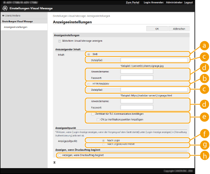 Der Inhalt wird zu den folgenden Zeitpunkten angezeigt. Wenn <Einstellungen Anzeige Login-Anzeige> auf <Anz. bei Start Gerätevorgang> gesetzt ist: Wählen Sie [Nach Login] oder [Nach Logout/Auto-Reset] Wenn <Einstellungen Anzeige Login-Anzeige> auf <Anzeige bei Auswahl Fkt.> festgelegt ist: Die Anzeige erfolgt, wenn der Modus zur automatischen Rückstellung initiiert wird. Wenn <Anwenderauthentisierung verwenden> auf <Aus> festgelegt ist: Die Anzeige erfolgt, wenn der Modus zur automatischen Rückstellung initiiert wird. Wenn visuelle Nachrichten aktiviert sind, lassen sich deren Inhalte jederzeit unter <Visual Message> im Startseite einsehen. Legen Sie für den anzuzeigenden Inhalt eine Datei fest, die auf einem Dateiserver oder in der Erweiterten Box eines anderen Canon Multifunktionsdruckers im selben Netzwerk gespeichert ist. Arbeiten mit anderen Geräten Sie können über einen Proxy-Server auch eine Webseite auf dem Internet als Inhalt festlegen. Die Proxy-Einstellungen, die für diese Funktion verwendet werden, sind die gleichen wie die Einstellungen unter <Einstellungen Proxy>. Wenn die Funktion für erzwungen angehaltene Druckaufträge und das Kontrollkästchen für [Wenn Druckauftrag startet anzeigen] aktiviert sind, wird zu Beginn des Druckens der Inhalt angezeigt. |