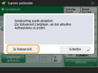 So überprüfen Sie die Gesamtanzahl der angegebenen EmpfängerDie Gesamtanzahl der angegebenen Empfänger wird oben rechts am Bildschirm angezeigt. Dadurch können Sie vor dem Senden bestätigen, dass die Anzahl der Empfänger korrekt ist. ![]() Um einen Auftrag, der gerade gesendet wird, sofort abzubrechen, gehen Sie wie folgt vor.Wenn Sie während des Sendens eines Auftrags auf dem Bedienfeld drücken, erscheint die Meldung <Soll der folgende Sendeauftrag abgebrochen werden?>. Drücken Sie <Ja>, um den Sendevorgang abzubrechen.Sie können <Zuletzt empfangener Auftrag> oder <Gesendeter Auftrag> wählen, um den Auftrag zu bestimmen, der abgebrochen werden soll. <Abzubrechender Auftrag bei Betätigen von Stopp> Drücken Sie bei mehreren Sendeaufträgen auf , um die Anzeige zur Auswahl des abzubrechenden Sendeauftrags aufzurufen. Wenn der Sendeauftrag, den Sie abbrechen möchten, nicht angezeigt wird, drücken Sie <Andere Aufträge prüf.>, um <Sendeaufträge> einzublenden. Wählen Sie den Auftrag, den Sie abbrechen möchten, und drücken Sie <Abbrechen>.So prüfen Sie den Status gesendeter/gespeicherter DokumenteIm Fenster <Statusmonitor> können Sie den Status gesendeter/gespeicherter Dokumente prüfen. Mit diesem Fenster können Sie Dokumente erneut senden/speichern, oder den Sende-/Speichervorgang nach Überprüfung des Status abbrechen. Überprüfen des Status und des Protokolls bei gescannten Dokumenten Wenn <Benachricht.anzeigen, wenn ein Auftrag akzeptiert ist> auf <Ein> gestellt wird, kann der <Statusmonitor>-Bildschirm über folgenden Bildschirm angezeigt werden, der nach Empfang eines Sendeauftrags eingeblendet wird. <Benachricht.anzeigen, wenn ein Auftrag akzeptiert ist> ![]() So drucken Sie den Bericht für die Sende-/SpeicherergebnisseWenn Sie auf der Anzeige für Grundeigenschaften des Scannens auf <Optionen> <SE Ergebnisbericht> drücken, können Sie festlegen, dass der Bericht mit den Sende-/Speicherergebnissen automatisch gedruckt wird.Um dies für jeden Auftrag von <Optionen> einzustellen, müssen Sie <Nur bei Fehler> oder <Aus> in <SE Ergebnisbericht> wählen und dann <Drucken über Optionen zulassen> auf <Ein> einstellen. DateinameBeim Senden/Speichern einer Datei wird automatisch der Dateiname für die Datei im folgenden Format festgelegt. Sie können die Einstellung ändern, sodass ein anderer Name zugewiesen werden kann. Festlegen eines Dateinamens Beim Senden per E-Mail Format "Auftragsnummern (vier Stellen)_Seitenzahlen (drei Stellen).Dateierweiterung", wie "1042_001.jpg" Beim Speichern in einem Dateiserver Format "Jahr, Monat, Tag, Stunde, Minute und Sekunde des Speicherzeitpunkts (14 Stellen).Dateierweiterung", wie "20151030133541.jpg" E-Mail-BetreffDer in <Standardthema> eingegebene Betreff wird automatisch festgelegt (<Standardthema>). Wenn Sie einen anderen Betreff angeben, ändern Sie die Einstellung, oder legen Sie jedes Mal beim Senden einer E-Mail den Betreff fest (Festlegen der E-Mail-Einstellungen). |