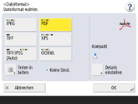 ![]() | Die gescannten Originale werden in elektronische Dateien wie beispielsweise PDF konvertiert. Wählen Sie das Dateiformat gemäß Ihrem Verwendungszweck und dem Nutzungsumfeld aus. |