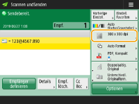 Bestimmen der Oberkante und Unterkante eines OriginalsSie können die Dokumentenausrichtung vor dem Scannen festlegen, sodass die Oberseite und Unterseite korrekt positioniert sind, wenn die gesendete/gespeicherte Datei auf einem Computer angezeigt werden. Drücken Sie beim Platzieren eines Originals im A4-Format auf der Anzeige für Grundeigenschaften des Scannens auf <Optionen> <Inhaltsausricht. Original> <Oben an hinterer Kante> <OK>.Wenn Sie großformatige Originale (z. B. im A3-Format) platzieren, drücken Sie auf der Anzeige für Grundeigenschaften des Scannens auf <Optionen> <Inhaltsausricht. Original> , wählen Sie je nach Ausrichtung des Originals <Oben an hinterer Kante> oder <Oben an seitlicher Kante> aus, und drücken Sie auf <OK>.Festlegen mehrerer Empfänger einschließlich FaxnachrichtenDurch das Festlegen von <Fax in der Funktion Scannen und Senden aktivieren> auf <Ein> können Sie Faxempfänger in der Anzeige für Grundfunktionen des Scannens (<Faxfunktion anzeigen>) festlegen. Diese Einstellung ist zweckdienlich für die Festlegung mehrerer Empfänger einschließlich von Faxnachrichten, beispielsweise, wenn Sie eine Kopie einer gesendeten Faxnachricht in einem Dateiserver speichern. Prüfen gescannter Bilder vor dem Senden/SpeichernSie können gescannte Bilder auf dem Vorschaubildschirm vor dem Senden/Speichern prüfen. Prüfen der gescannten Originale vor dem Sende-/Speichervorgang (Vorschau) Speichern häufig verwendeter EinstellungenSie können häufig verwendete Ziele und Scaneinstellungen auf einer Schaltfläche des Geräts für den späteren Gebrauch kombinieren. Indem Sie die registrierte Schaltfläche beim Scannen von Originalen drücken, können Sie Ihre Einstellungen schnell abschließen. Speichern einer Kombination häufig genutzter Funktionen |