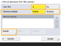Para <Directiva prefijada>, seleccione <Rechazar> para permitir únicamente la comunicación con dispositivos que tengan una dirección IP especificada en <Direcciones excluidas> en el próximo paso, o seleccione <Permitir> para rechazar la comunicación con ellos.