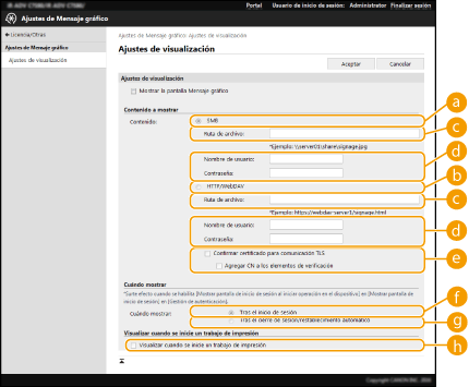 Para visualizar el contenido después de iniciarse el modo de reinicio automático, configure <Tiempo para reinicio automático> en un minuto o más. Para obtener información sobre los formatos de archivo y los tamaños de datos que se pueden mostrar, consulte Funciones de gestión. Esta opción solo puede especificarla un usuario con privilegios de administrador. Este ajuste puede importarse/exportarse. El mismo ajuste puede importarse en varios dispositivos (solo dispositivos de Canon que admitan la función Mensaje gráfico) para que se muestre el mismo aviso o información en varios dispositivos. Importar/exportar datos de configuración [Ruta de archivo:] se importa/exporta con esta opción. Si se especifica un archivo en el Espacio avanzado, especifique la ruta donde se encuentra en archivo en [Ruta de archivo:]. Si desea realizar operaciones de inicio de sesión, llévelas a cabo tras cerrar la pantalla Mensaje gráfico. Inicio de sesión en el equipo |