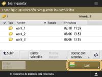 Si <Seleccionar opción al conectar dispositivo de memoria> se configura en <Sí>, se muestra un acceso directo a <Leer y guardar en dispositivo de memoria> al introducir dispositivos de memoria. Pulse <Leer y guardar en dispositivo de memoria> y siga con el paso 4. <Seleccionar opción al conectar dispositivo de memoria> Inserción de dispositivos de memoria