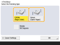 Depending on the paper type, you cannot use finishing functions. Hardware Specifications When placing an original on the platen glassPressing <Options> <Job Build> on the Copy Basic Features screen enables you to use the Collate/Group function even if the original is placed on the platen glass.Insert a job separator between each page during a group outputIf you select <Group (Same Pages)>, you can insert a job separator between each group. For more information, see <Job Separator Between Groups>. <Copy> <Job Separator Between Groups>When configuring settings in <Access Stored Files>You can use finishing functions only when printing PDF/XPS files. |