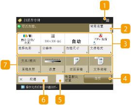 在<主页>屏幕上按<扫描后存储>,然后按<网络>或<存储介质>扫描原稿时,会显示以下设置屏幕。