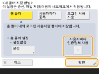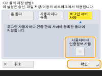 2 | 사용할 인증 정보를 선택하고 <확인>을 누릅니다. 개인 폴더마다 다른 이름과 비밀번호를 사용하려면 <사용자마다 인증정보 사용>을 눌러 체크 표시를 합니다. 동일한 사용자 이름 및 비밀번호를 입력하여 로그인하려면 체크 표시를 해제합니다. 이 항목에 체크 표시를 할 경우, 각 사용자별로 사용자 이름 및 비밀번호를 등록해야 합니다. ![]() ![]() 개인 폴더에 액세스하는 데 필요한 인증 정보 (사용자 이름과 비밀번호) 를 Active Directory에서 가져올 수 있습니다. <사용자마다 인증정보 사용>을 선택하면, 키보드 인증을 사용하여 기기에 로그인하기 위한 사용자 이름과 비밀번호가 개인 폴더에 액세스하기 위한 인증 정보로 등록됩니다. ![]() 이 기능을 지원하는 로그인 서비스를 사용해야 합니다. 자세한 정보는 지역 공인 Canon 대리점에 문의하십시오. 사용자 인증을 사용하고 있다면 “\\host name\folder path” 형식을 사용하여 Active Direcctory의 사용자 속성인 “homeDir”에 폴더를 구성합니다. |