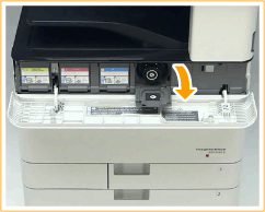 Subjecteu els costats dret i esquerre de la tapa de canvi de tòner i estireu la tapa cap a on sou per obrir-la. S'obrirà la tapa de canvi (tapa petita) de la ranura corresponent al tòner que cal substituir.