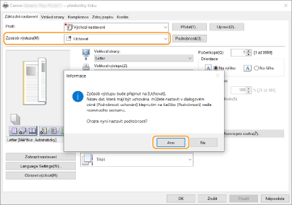 Vyberte [Uchovat] z [Způsob výstupu] a klikněte na [Ano].